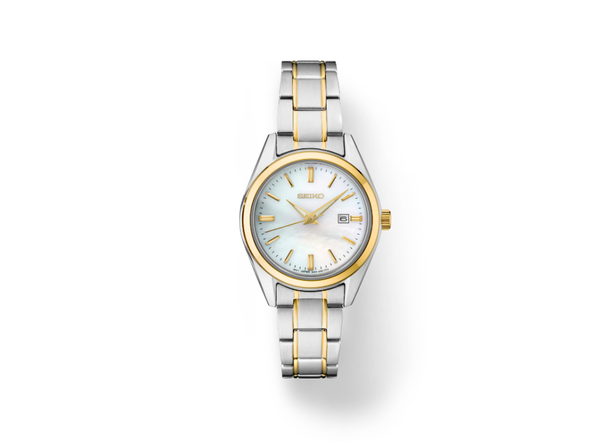 From the Essentials Collection. With classic dress/sport styling, this perfectly tailored design combines sophisticated minimalism with versatility. The elegant mother-of-pearl dial features a date calendar and LumiBrite hands. In stainless steel with two-tone finish, and sapphire crystal for superior scratch resistance. 10 bar, 100M Water Resistant.