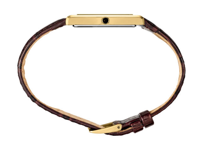 From the Essentials Collection. Offering classic dress/sport design, the Essentials Collection provides the ideal solution for everyday wear. Giving a new slant to a traditional rectangular style with a subtly patterned light champagne sunray dial, this perfectly tailored watch features a stainless steel case in gold finish, cabochon crown and textured brown leather strap. 3 bar, 30M Water Resistant.