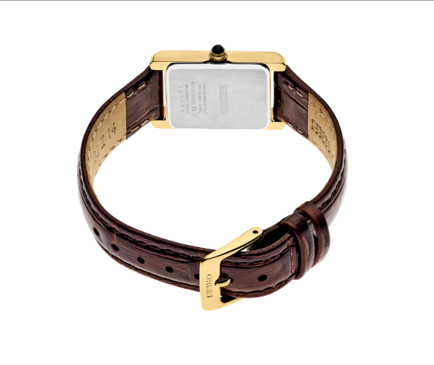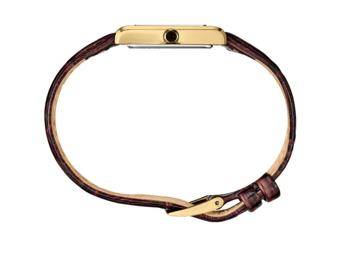 From the Essentials Collection. Offering classic dress/sport design, the Essentials Collection provides the ideal solution for everyday wear. Giving a new slant to a traditional rectangular style with a subtly patterned light champagne sunray dial, this perfectly tailored watch features a stainless steel case in gold finish, cabochon crown and textured brown leather strap. 3 bar, 30M Water Resistant.