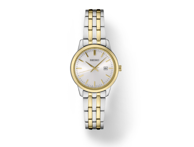 From the Essentials Collection. Offering classic designs, the Essentials Collection provides the ideal solution for all-day wear. Crafted of stainless steel in versatile two-tone finish, this perfectly tailored watch features a contemporary minimalist white dial with gold hands and markers, as well as a date calendar, for a superb blend of clarity and style. 5 bar, 50M Water Resistant.