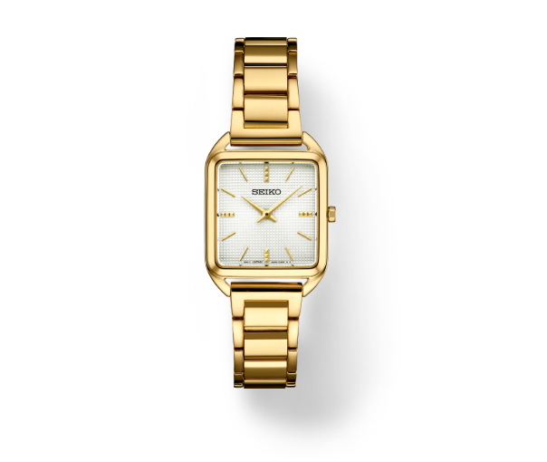 From the Essentials Collection. With a fresh square case design, this light and slim watch is proportioned for a perfect fit. The silver-white die-stamped grid pattern dial and subtly textured gold markers add a hint of sophisticated luxury. Crafted of stainless steel with gold finish and tri-fold push button release clasp. 5 bar, 50M Water Resistant.