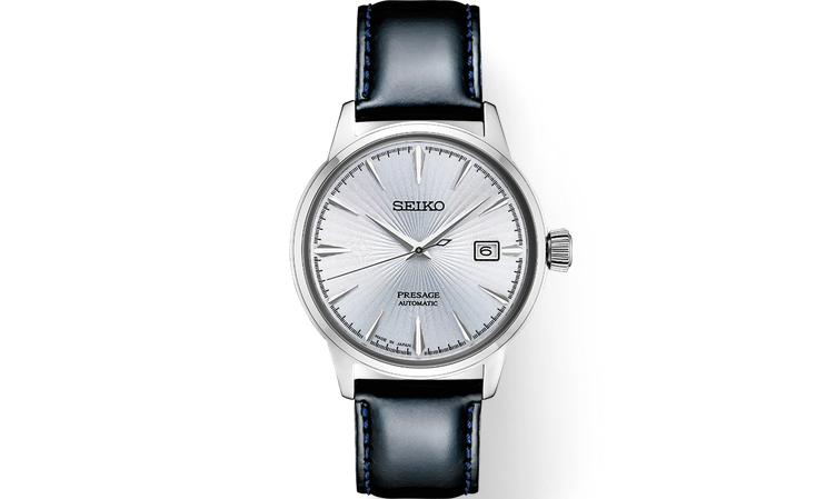 Seiko Presage Automatic. This refine men’s watch is designed with a stainless steel case and black leather strap. The dial features a light deep, pressed pattern whose shimmering beauty is enhanced by seven layers of gloss finish and the clarity of the box-shaped crystals. The hands are delicately curved by skilled craftsmen and women to give the watch case a slimmer profile. When turning the uniquely shaped crown, you can feel the strong torque of the winding mechanism. Automatic movement allows self and automatic winding capabilities and features 21,600 vibrations per hour, with a power reserve of approximately 41 hours, as well as 23 jewels. 50M Water Resistant.