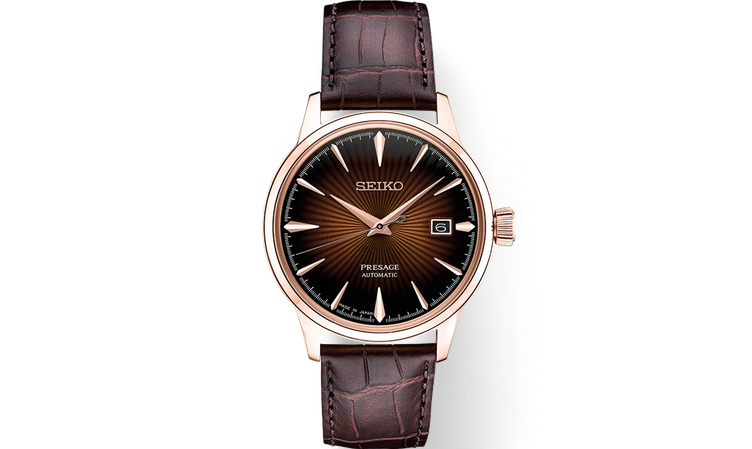 Seiko Presage Automatic. This refine men’s watch is designed with a rose gold-finish stainless steel case and brown leather strap. The dial features a burgundy deep, pressed pattern whose shimmering beauty is enhanced by seven layers of gloss finish and the clarity of the box-shaped crystals. The hands are delicately curved by skilled craftsmen and women to give the watch case a slimmer profile. When turning the uniquely shaped crown, you can feel the strong torque of the winding mechanism. Automatic movement allows self and automatic winding capabilities and features 21,600 vibrations per hour, with a power reserve of approximately 41 hours, as well as 23 jewels. 50M Water Resistant.