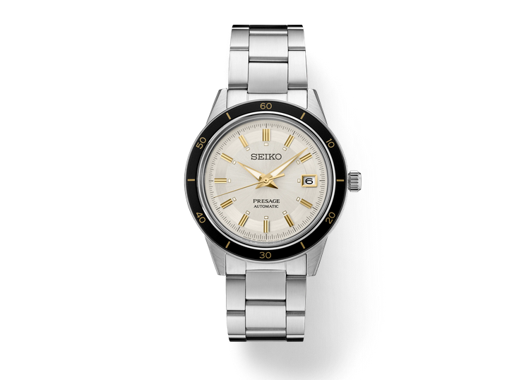 Presage Style60's Collection. Offering the finest in Japanese mechanical watchmaking, the Presage Collection blends precision technology with superior craftsmanship and design. With broad angular lines and such vintage details as box-shaped crystals, faceted indices and sharp hand design, plus the use of neutrals and earth tones, the Style60's collection creates a warm, retro feel perfect for today. Celebrating the fresh spirit of the 1960s, the collection takes particular inspiration from Seiko’s 1964 “Crown Chronograph,” Japan’s first watch with a stopwatch function. Framed by a black bezel with gold accents, the ivory dial includes a date calendar and LumiBrite hands and markers. The screwdown see-through caseback provides a view of the 23-jewel movement with manual winding capability, a frequency of 21,600 vibrations per hour and a power reserve of approximately 41 hours. Crafted of stainless steel, this distinctive timepiece includes a tri-fold push button release clasp. 5 bar, 50M Water Resistant.