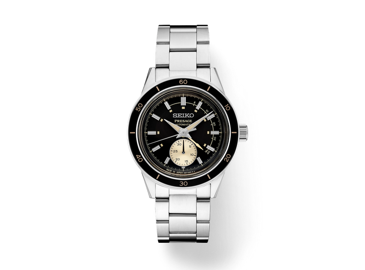 Presage Style60's Collection. Offering the finest in Japanese mechanical watchmaking, the Presage Collection blends precision technology with superior craftsmanship and design. With broad angular lines and such vintage details as box-shaped crystals, faceted indices and sharp hand design, plus the use of neutrals and earth tones, the Style60's collection creates a warm, retro feel. Celebrating the fresh spirit of the 1960s, the collection takes particular inspiration from Seiko’s 1964 “Crown Chronograph,” Japan’s first watch with a stopwatch function. Framed by a black bezel, the charcoal dial features power reserve and date displays, as well as beige LumiBrite hands and markers. The screwdown see-through caseback provides a view of the 29-jewel movement with manual winding capability, a frequency of 21,600 vibrations per hour and a power reserve of approximately 41 hours. Crafted of stainless steel, this exceptional timepiece includes a box-shaped crystal and tri-fold push button release clasp. 5 bar, 50M Water Resistant.