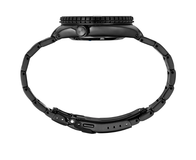 Prospex Black Series. Designed for those who treat life as the ultimate adventure, Seiko Prospex keeps moving forward, meeting every challenge with technological excellence and winning design. Featuring “Green LumiBrite Pro, " developed for divers by combining the color most recognizable in the dark with a higher brightness and longer afterglow, this extraordinary timepiece provides a "night vision" experience for visibility in the dark resembling the view seen through a night scope. The striking dark gray dial also features a magnified day/date calendar and is framed by black ceramic uni-directional rotating elapsed timing bezel. Following ISO standards for scuba diving, this Prospex Black Series model offers a stainless steel case and bracelet with black hard coating, a design based on one of Seiko’s most iconic diving styles, and includes a screwdown crown and caseback, a sapphire crystal with anti-reflective coating on the inner surface, and a tri-fold push button release clasp with secure lock and extender. For reliable timing in rough waters, the 24-jewel automatic movement beats at a frequency of 21,600 vibrations per hour, with a power reserve of approximately 41 hours and manual winding capability. 200m Water Resistant.