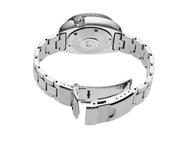 Prospex PADI Special Edition. Designed for those who treat life as the ultimate adventure, Seiko Prospex keeps moving forward, meeting every challenge with technological excellence and winning design. This stunning Special Edition celebrates Seiko’s official partnership with PADI, the world’s leading scuba diver training operation, particularly in the distinctive patterned and gradated blue dial reflecting the surface of the ocean as seen from under water as the sunlight reaches through the waves on the surface. With a magnified day/date calendar, the dial also features LumiBrite hands and markers with a unique blue glow recalling signature PADI colors, while vibrant blue accents on the blue ceramic uni-directional rotating elapsed timing bezel continue the PADI theme. Following ISO standards for scuba diving, this exceptionally durable timepiece offers a rugged stainless steel case and bracelet based on one of Seiko’s most iconic diving styles, screwdown crown and caseback, sapphire crystal with anti-reflective coating on the inner surface, and a tri-fold push button release clasp with secure lock and extender. For reliable timing in rough waters, the 24-jewel automatic movement beats at a frequency of 21,600 vibrations per hour, with a power reserve of approximately 41 hours, and offers manual winding capability. 200m Water Resistant.