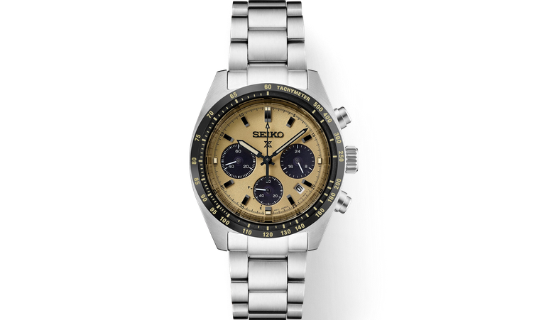 Prospex Speedtimer Solar Chronograph. Designed for those who treat life as the ultimate adventure, Seiko Prospex keeps moving forward, meeting every challenge with technological excellence and winning design. Combining precision timing with wearability and the energy efficiency of solar power, this exceptional watch, inspired by Seiko’s first precision chronographs, developed for international sporting competitions in 1964, provides chronograph measurement of up to 60 minutes of elapsed time in 1/5-second increments and includes a split time function. The solar cell, powered by any light source, with no battery change required, offers a 6-month power reserve when fully charged. Framed by a black tachymeter bezel, the yellow dial, with distinctive sand-blasted texture, features three black subdials, including a 24-hour indicator, as well as a date calendar and beige LumiBrite hands and markers. In stainless steel, with curved anti-reflective sapphire crystal, this rugged timepiece also offers the security of a screwdown caseback and tri-fold push button release clasp. 10 bar, 100M Water Resistant.