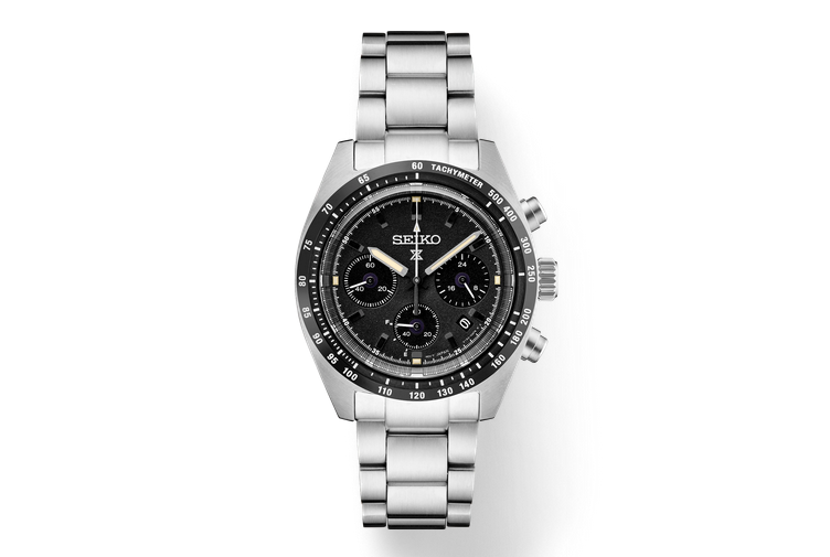 Prospex Speedtimer Solar Chronograph. Designed for those who treat life as the ultimate adventure, Seiko Prospex keeps moving forward, meeting every challenge with technological excellence and winning design. Combining precision timing with wearability and the energy efficiency of solar power, this exceptional watch, inspired by Seiko’s first precision chronographs, developed for international sporting competitions in 1964, provides chronograph measurement of up to 60 minutes of elapsed time in 1/5-second increments and includes a split time function. The solar cell, powered by any light source, with no battery change required, offers a 6-month power reserve when fully charged. Framed by a black tachymeter bezel, the rich black dial, with distinctive sand-blasted texture, features three black subdials, including a 24-hour indicator, as well as a date calendar and beige LumiBrite hands and markers. In stainless steel, with curved anti-reflective sapphire crystal, this rugged timepiece also offers the security of a screwdown caseback and tri-fold push button release clasp. 10 bar, 100M Water Resistant.