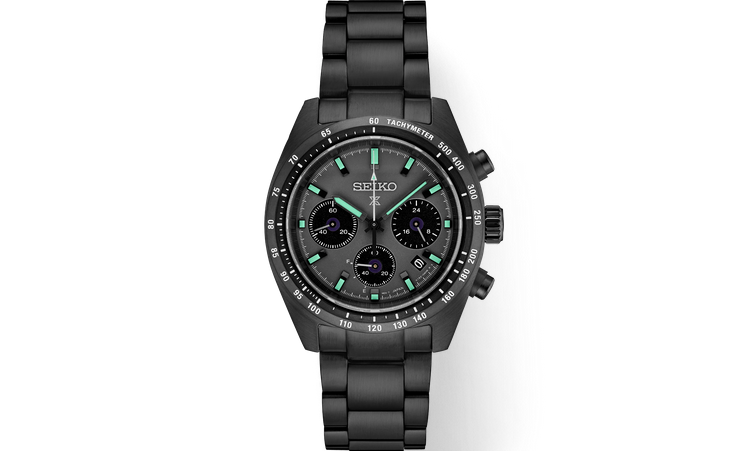 Prospex Black Series Speedtimer Solar Chronograph. Designed for those who treat life as the ultimate adventure, Seiko Prospex keeps moving forward, meeting every challenge with technological excellence and winning design. This dramatic watch is part of a high-intensity collection inspired by the 1969 “Speedtimer,” the world’s first self-winding chronograph, extending it to the Black Series. Featuring the newly developed “Green LumiBrite Pro,” developed for divers by combining the color most recognizable in the dark with a higher brightness and longer afterglow, this extraordinary timepiece provides a “night vision” for visibility in the dark similar to the view seen through a night scope. The chronograph function measures up to 60 minutes of elapsed time in 1/5-second increments and includes a split time function, while the solar cell, powered by any light source, with no battery change required, provides a 6-month power reserve when fully charged. The dark gray dial includes three black subdials, with a 24-hour indicator and power reserve indicator, as well as a date calendar and green LumiBrite on hands, markers and the tip of the chronograph hand. Crafted of stainless steel with black hard coating, curved anti-reflective sapphire crystal, black tachymeter bezel, secure screwdown caseback and tapered three-link bracelet with tri-fold push button release clasp. 10 bar, 100M Water Resistant.