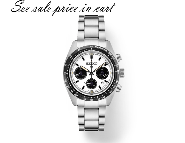 Seiko Speedtimer Solar Chronograph. Designed for those who treat life as the ultimate adventure, Seiko Prospex keeps moving forward, meeting every challenge with technological excellence and winning design. Combining precision timing with wearability and the energy efficiency of solar power, this exceptional watch, inspired by Seiko’s first precision chronographs, developed for international sporting competitions in 1964, provides chronograph measurement of up to 60 minutes of elapsed time in 1/5-second increments and includes a split time function. The solar cell, powered by any light source, with no battery change required, offers a 6-month power reserve when fully charged. Framed by a black tachymeter bezel, the white dial, with distinctive sand-blasted texture, features three black subdials, including a 24-hour indicator, as well as a date calendar and beige LumiBrite hands and markers. In stainless steel, with curved anti-reflective sapphire crystal, this rugged timepiece also offers the security of a screwdown caseback and tri-fold push button release clasp. 10 bar, 100M Water Resistant.