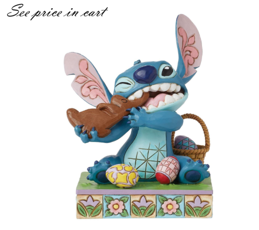 Delight in the whimsical charm of Jim Shore as Stitch the alien indulges in Easter festivities, surrounded by a colorful array of Easter eggs. With mischief twinkling in his eyes, Stitch gleefully nibbles on a chocolate bunny with contagious joy.