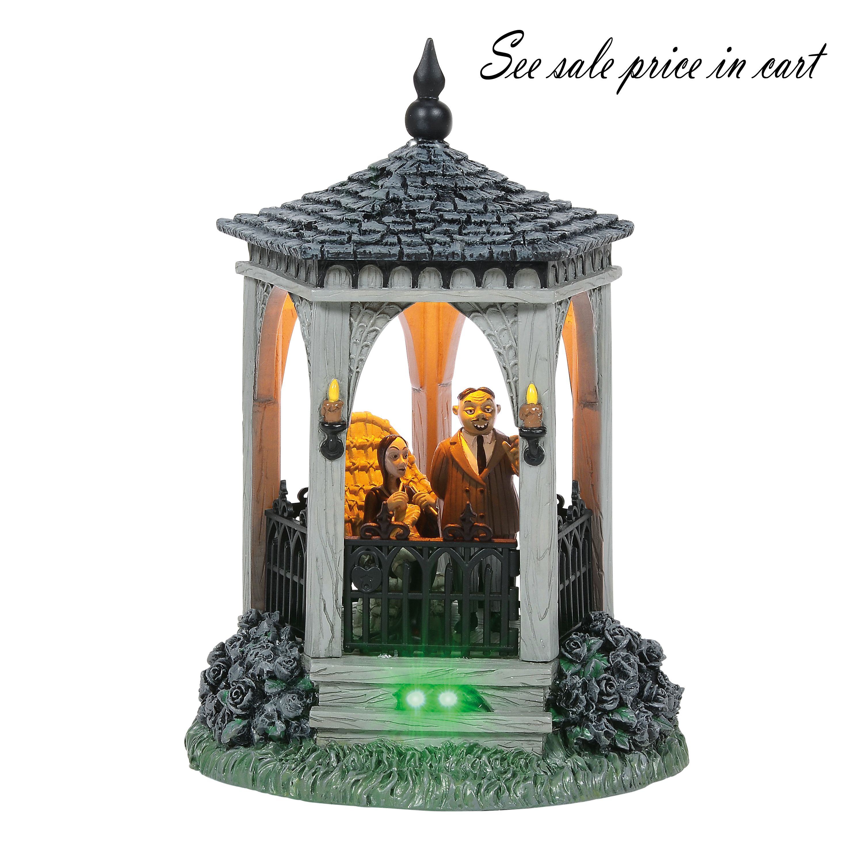 Being from New York City, the Addams Family loves to spend long evenings in Central Park. With the new Gazebo, Gomez and Morticia can continue to enjoy the night, with or without moonlight, from their own yard. LED lit. Hand-crafted, hand-painted resin.