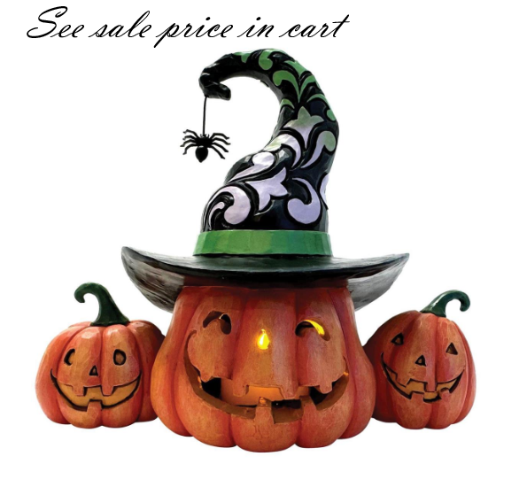 Embrace the playful Halloween spirit with this charming Jim Shore figurine scene featuring three smiling jack-o-lanterns. The largest of them sits in the middle, wearing a witch's hat lights up! This trio are altogether spooky. Tea Light included.