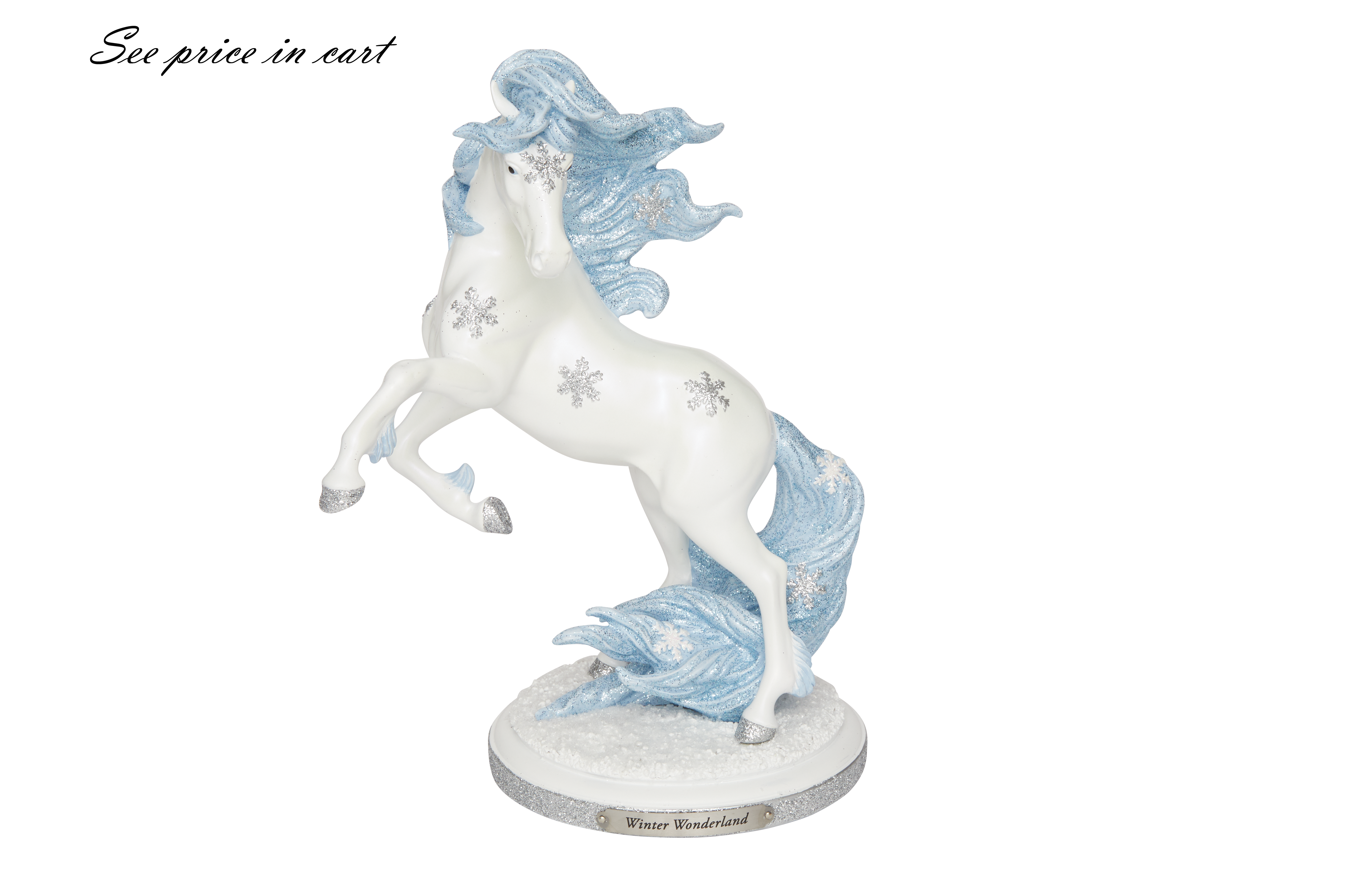 This striking stallion is a winter wonder. Covered in sparkling silver snowflakes, this white steed rears its front hooves as it balances on a patch of snow. Glittering blue hair billows in the winter wind magic enters the season.