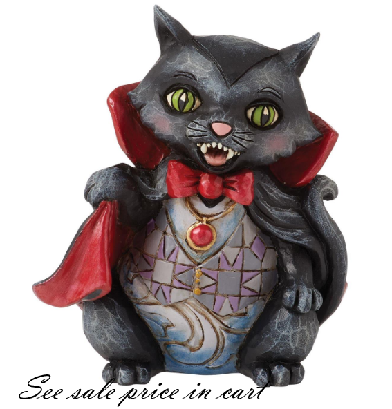 Get into the mini side of the Halloween spirit with this adorable mini Jim Shore figurine of a black cat dressed as a vampire. The smiling kitty wears a red cloak and bowtie in a purple ensemble. He bears his pointy little fangs.