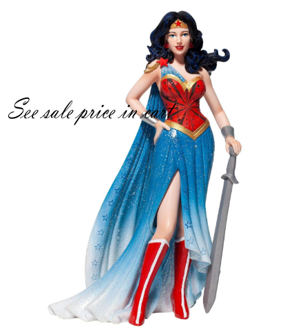 Fierce meets fabulous in this meticulously reimagined hand-crafted figure inspired by DC Comics most iconic heroine. Shimmering with glitter and metallic gold accents on her flowing cape and stylish skirt, Wonder Woman stands ready to conquer the world.
